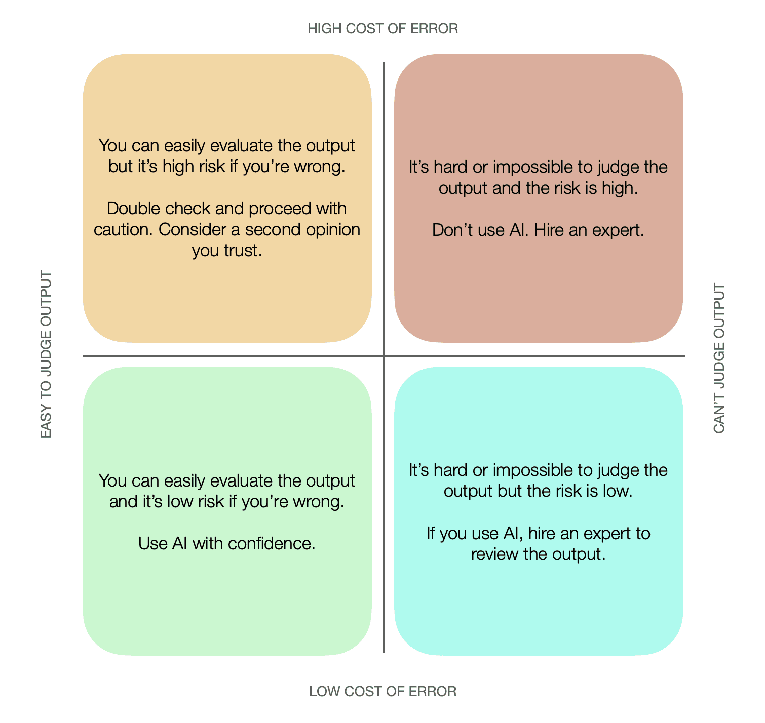 The quadrant has two axis. One for how well you can evaluate the output your AI gives you, and one for how damaging it would be to your business if the output were bad.