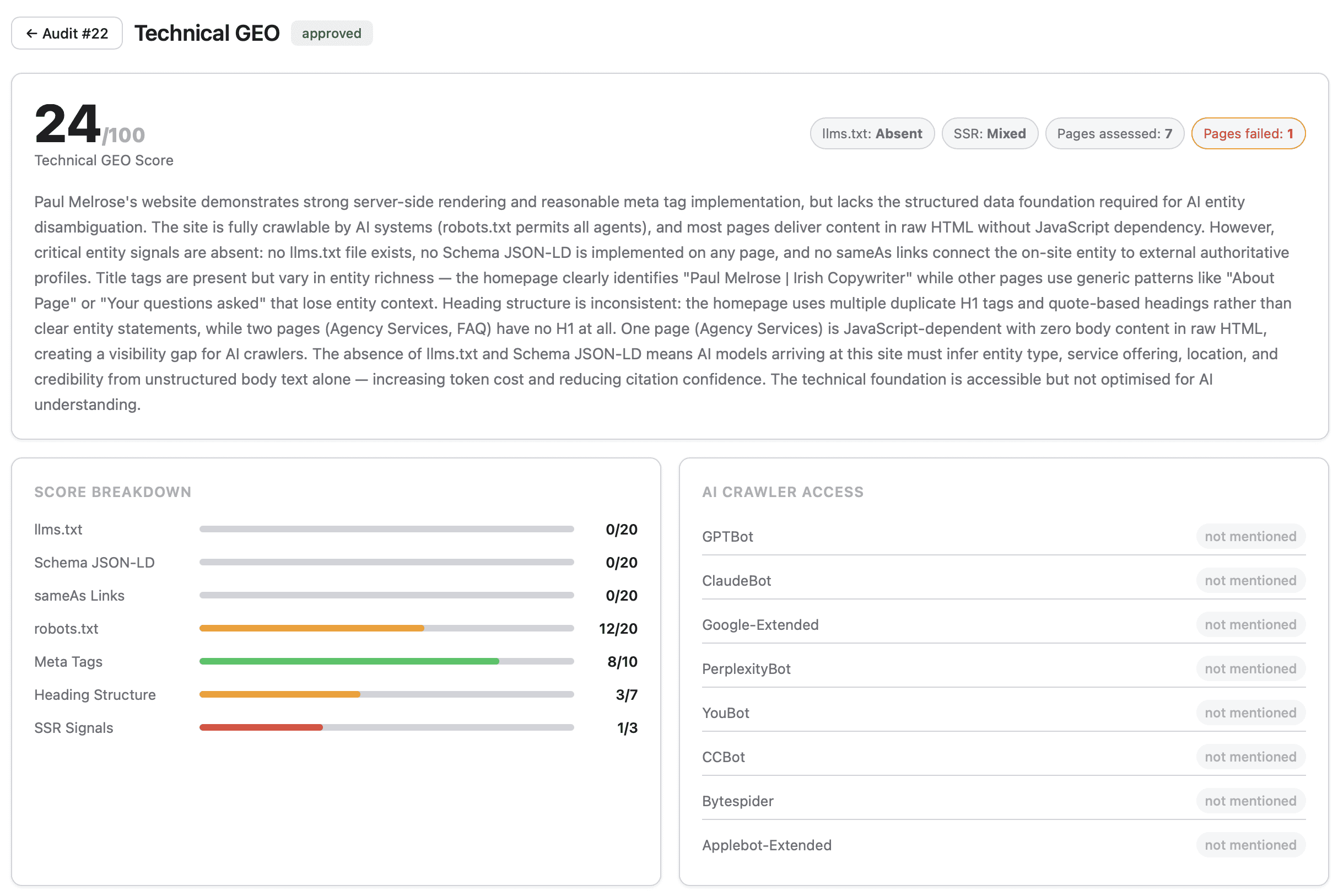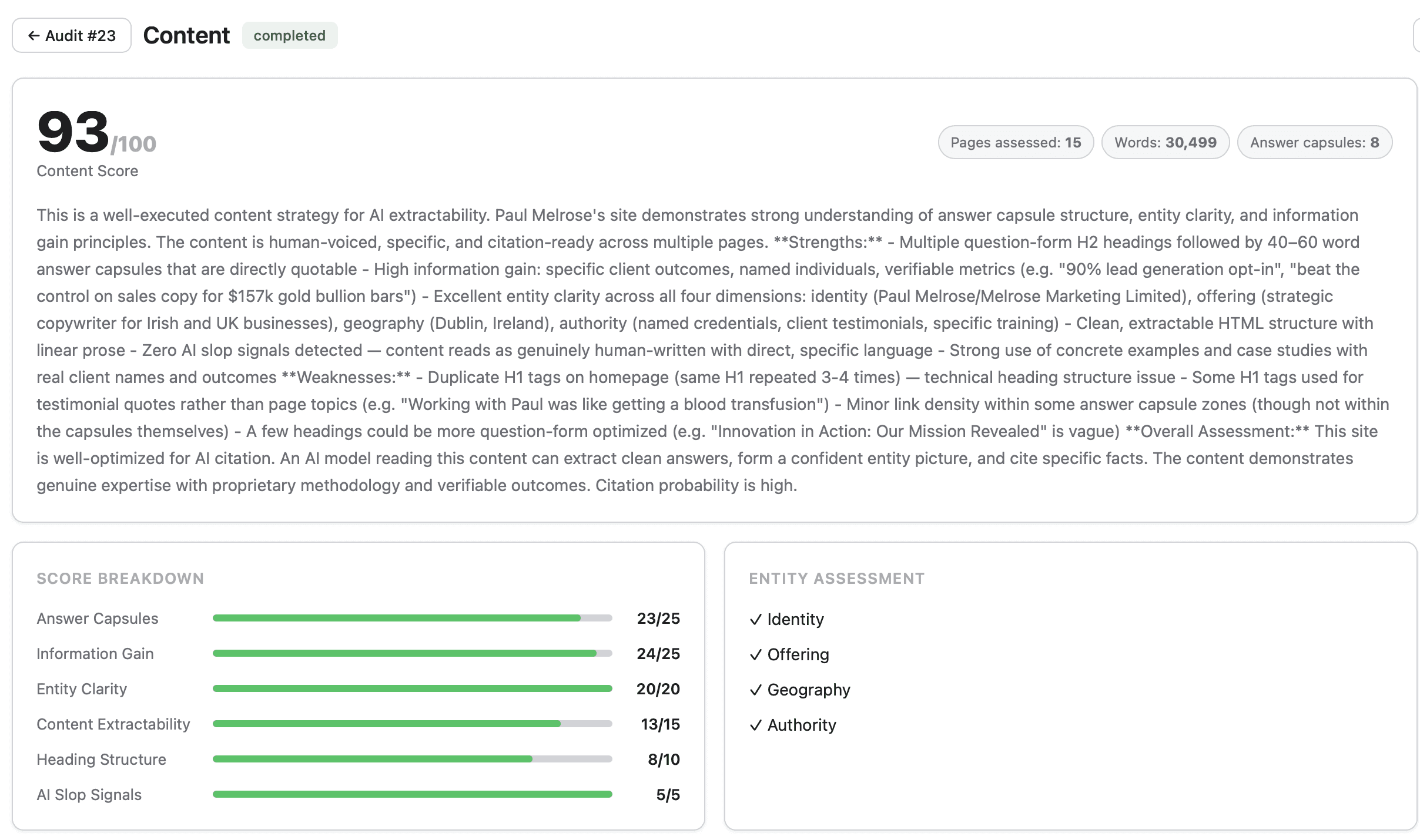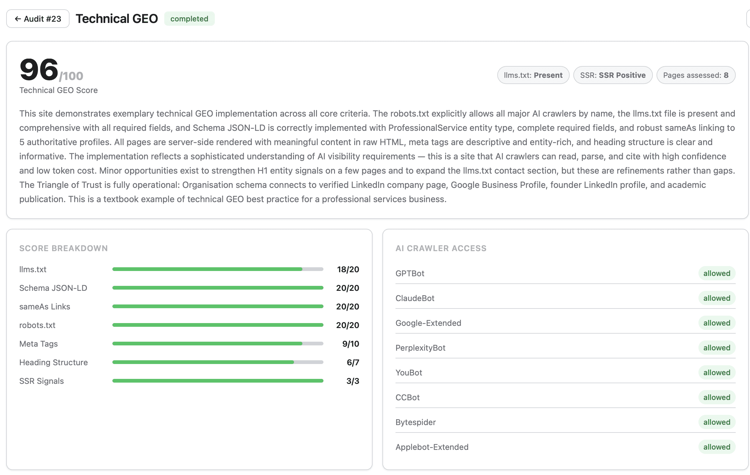 It analyses the technical infrastructure AI crawlers need to read a site, the content structure that determines whether key answers are extractable, and the entity signals that tell AI systems the business is real and credible. Benchmarked, scored, repeatable. It also gave me detailed technical and content recommendations based on best practices in GEO.